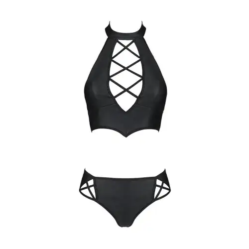 Этот потрясающий комплект нижнего белья, изготовленный из высококачественной экокожи, состоит из бюстгальтера и трусиков с замысловатой шнуровкой, которая придает вашему образу дополнительную чувственность. Черный цвет является классическим и неподвластным времени, поэтому его легко сочетать с любым нарядом или событием.