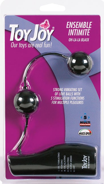 Вибро шарики ENSEMBLE INTIMITE BLACK. Можно применять как для вагианльной, так и для анальной стимуляции. Есть проводной внешний пульт управления. Пять  режимов вибрации - пульсация, эскалация и т.д. Диаметр - 3,1 см.