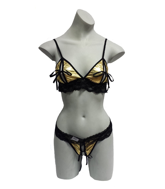 Сексуальный комплект. Состоит из бюстгальтера и трусиков. Есть прорези на сосках и в области промежности. В наличие есть золотистый и серебристый цвета. Размер: OS (универсальный). Размер и цвет уточняйте у менеджера магазина при заказе.