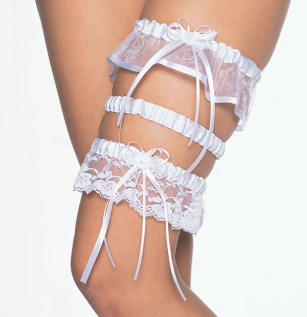 Роскошная белая подвязка с нежными кружевами из прекрасного сатина. Подходит ко многим эротическим комплектам. Производитель – Leg Avenue.