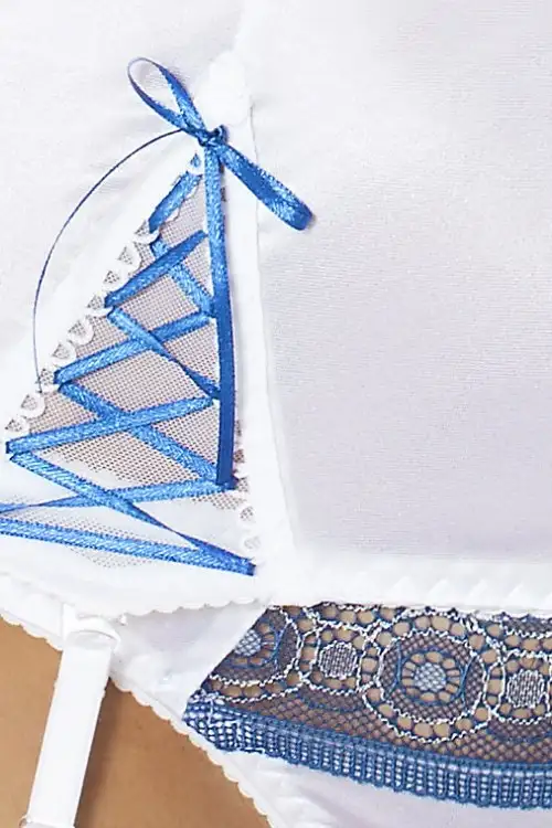 Белый цвет – это цвет невинности и непорочности. Чарующий образ нежной леди заведет мужчину. Ваш нежный образ быстро покорит мужчины. Потрясающий наряд поможет вам сделать прелюдию идеальной, а ночь – страстной. Красивый корсет ELENI CORSET от польского бренда Passion – это невероятно женственное и элегантное белье из коллекции Size Plus. Плотная ткань обтягивает соблазнительные формы и поможет вам скрыть все недостатки. Кружевной синий лиф подчеркивает сладкую грудь, а тонкие бретельки делают плечи изящнее. В комплекте идут трусики-стринги, а также съемные держатели чулок.