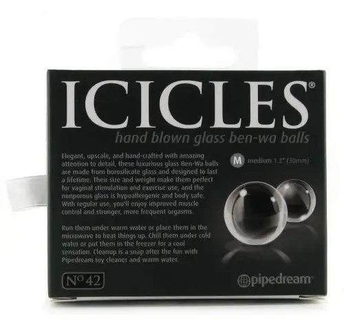 Вагинальные шарики ICICLES 42 MEDIUM GLASS BEN-WA. Сделаны из специального стекла, очень гладкие. Для более ярких ощущений можно нагреть или охладить под струей воды. Диаметр – 3 см , вес – 56 грам.