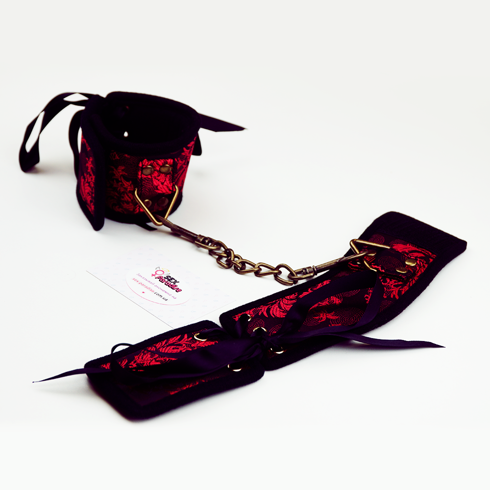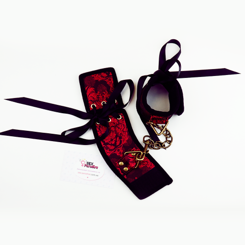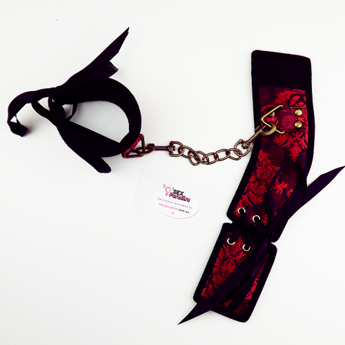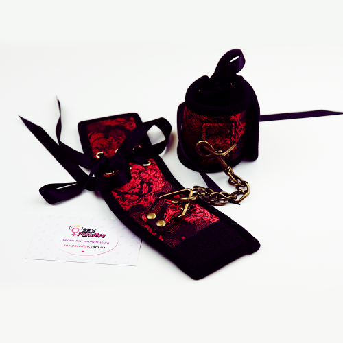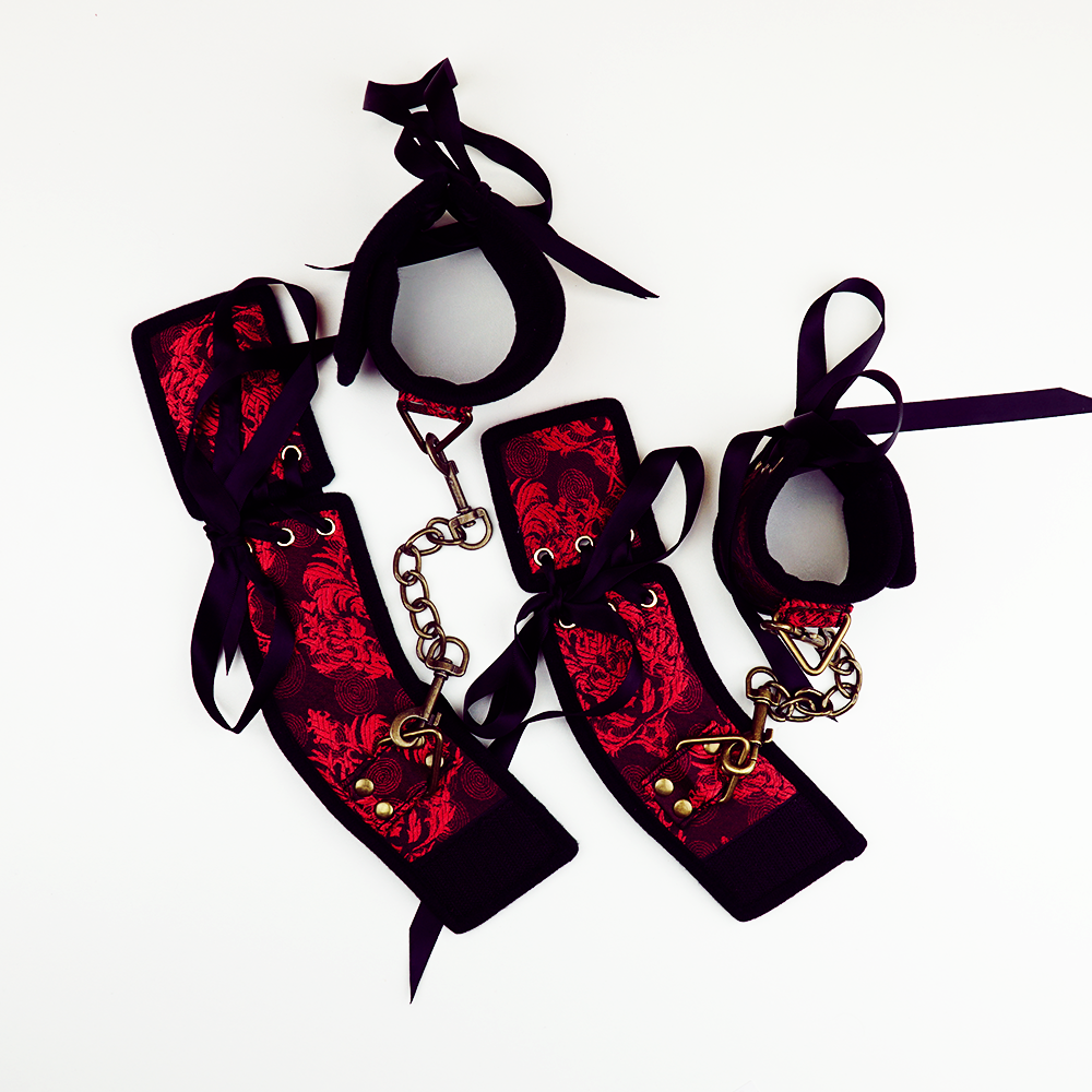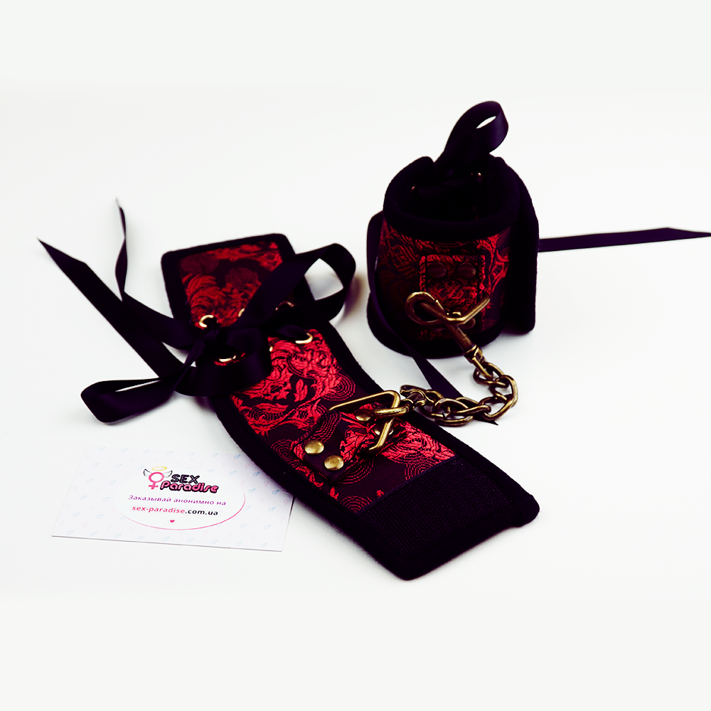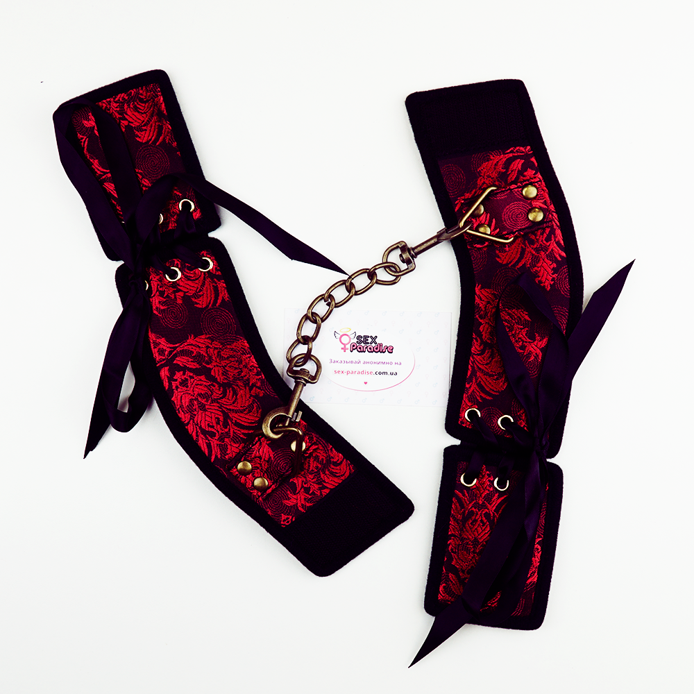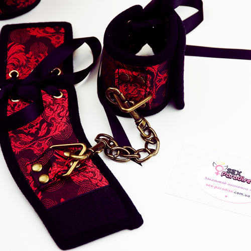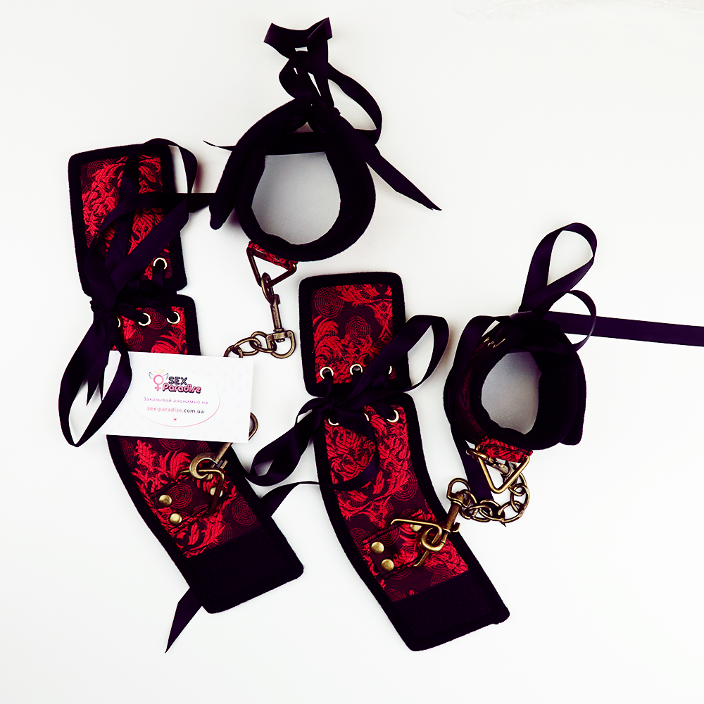 Наручники и поножи соединены между собой с помощью металлических цепочек с карабинами. Цвет предметов в наборе черный, с украшением винтажной вышивкой красного цвета. Наручники и поножи декорированы черной атласной лентой.