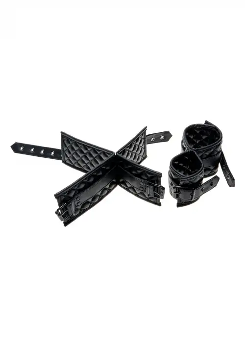 Специальные наручники и поножи обладают необычным стеганым рисунком, который придает оригинальный вид. В такой конструкции присутствуют ремни с пряжкой, что делает продукт универсальным. Изделия упаковываются в коробку с яркими деталями, благодаря чему такой комплект вы можете преподнести возлюбленной в качестве презента по торжественному случаю.