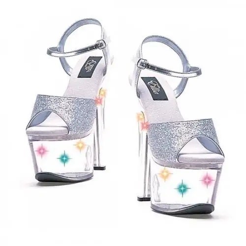 Женские cеребристые туфли на прозрачной платформе с разноцветными огоньками внутри. Высота каблука 18,0 см.